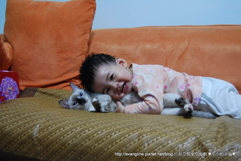 QQ貓之前就會給秀蓁玩!所以QQ是不怕小孩的!